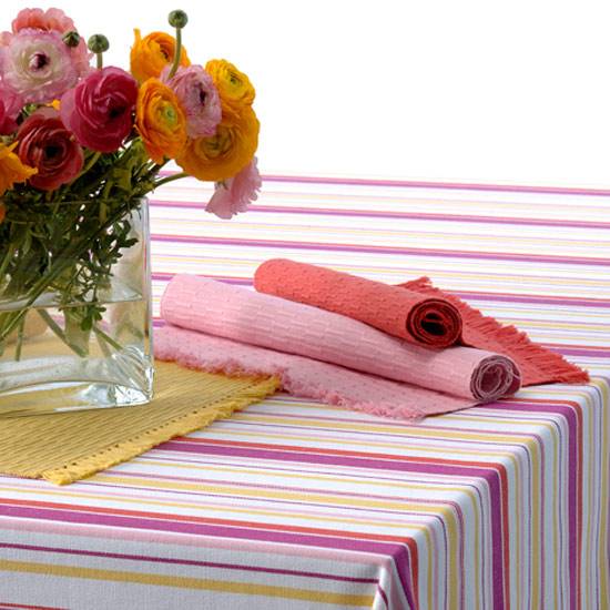 As shown are a set of table cloth with napkins. The table cloth has a stripe pattern with multi colours. The napkins are embroidered. They can fit in homes of various styles and give a harmonious feeling. The table cloth is suitable for both round tables and rectangular tables.
