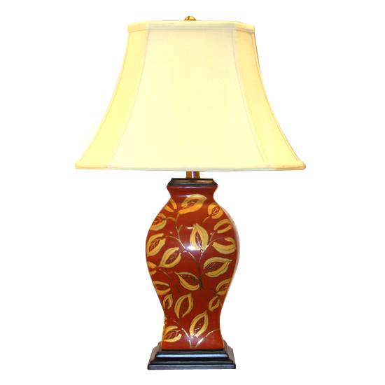 This is a table lamp with a decorative base. The lamp base is made of porcelain. The base of the table lamp is painted in elegant leaf patterns.