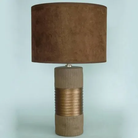 This cylindrical table lamp features a base with hand-clad bronze leather. The fusion of vertical and horizontal lines on the body creates a striking effect. The modern design adds an artistic accent as well as utility to any decor.