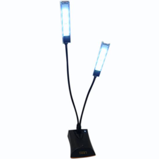 The table lamp features two lamp heads with a gooseneck design for flexible illumination. It has emergency light when the power is cut. Enhance your home decor with this chic and stylish USB lamp.