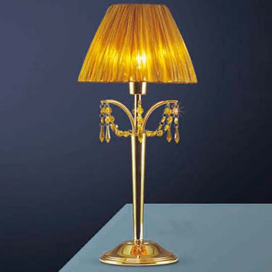This gorgeous table lamp is constructed of a golden stand decorated with amber-tone crystals, showcasing a sparkling touch. It is styled with a pleated golden lampshade. This glamorous table lamp is the perfect addition for your home.