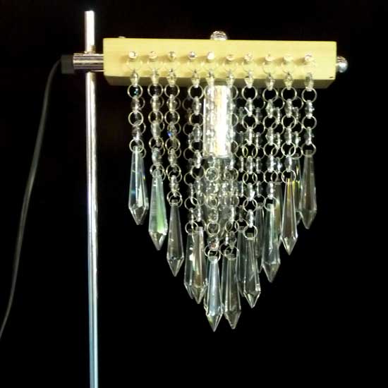 This table lamp is designed with hanging crystal-like adornments. The metallic construction looks modern and unique. This table lamp serves practical and decorative purposes.