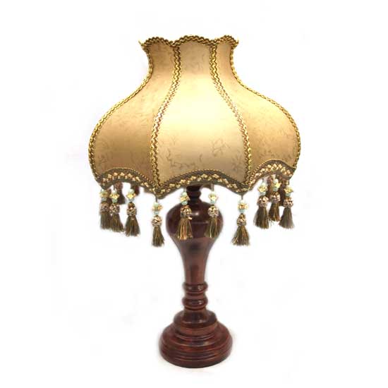 This vintage-style table lamp will bring a nostalgic touch to any interior decor. The flower-shaped fabric shade is adorned with tassels for added appeal. The solid wooden base showcases an attractive walnut finish.