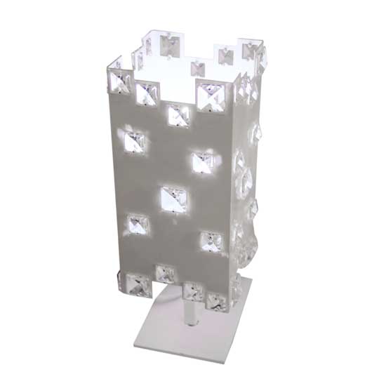 This beautiful table lamp features a rectangular-shaped shade studded with clear stones. The faceted stones refract light in a dazzling way. The quality table lamp is made of iron in a white finish.