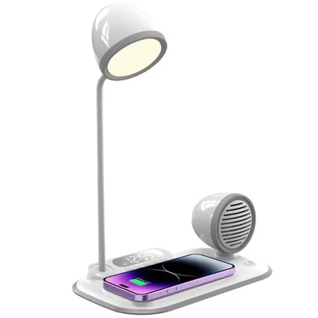 Bluetooth Speaker Table Lamp Alarm Clock with 15W wireless charger for phones & 5W wireless Charger for earbuds,adjusting lamp brightness by pressing or rotating the knob,theree types of light : white light,warm light,white/warm & infinite adjusting brightness mode