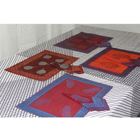 Presented is a set of table linen offering place mats, table runners and napkins. They are made with quality cotton for enhanced durability and more persistent colors. They are printed with hand-block and screen printing technology.