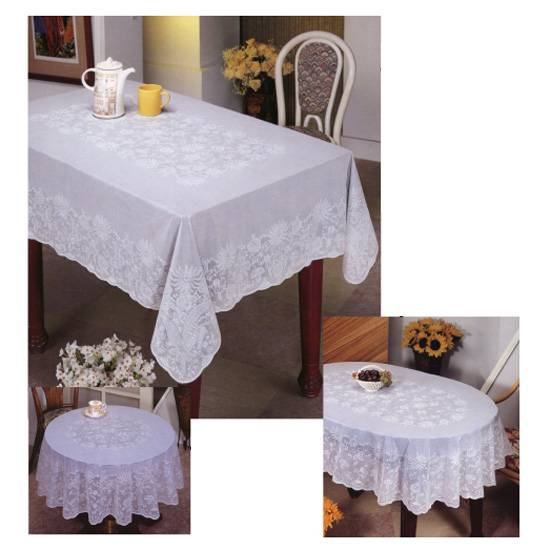 The featured items are embossed vinyl tablecloth, in white colour with flower pattern embossed on the tablecloth. Available in rectangular, round and oval shapes.
