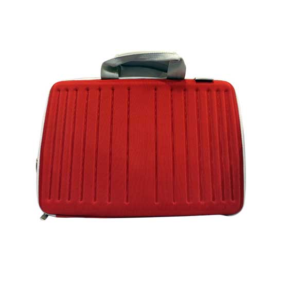 This tablet PC bag features a bold red-hued exterior with vertical lines. It is fitted with durable handles for easy carrying. This eye-catching tablet PC bag is great for daily use.