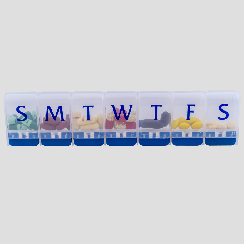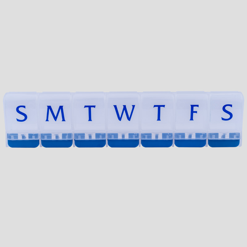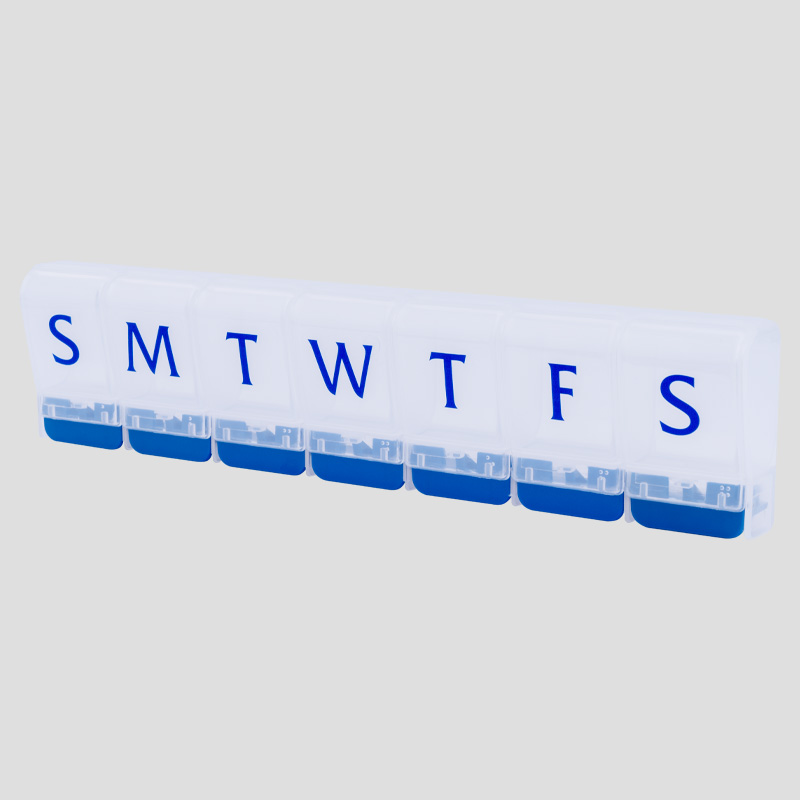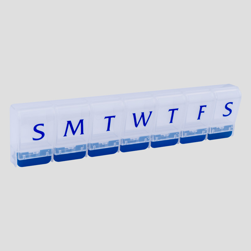 7-day pill box is made of PP. Medicine users can accurately divide medicines according to doctor's orders for each week's day. lt is convenient for the user to put the medicine to be eaten into the medicine compartment according to the dose for storage, so that it can be carried and taken on time. Store in a dry, ventilated place away from heat sources. Do not mix with chemicals or direct sunlight.