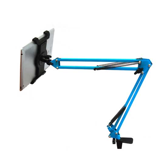 Displayed is a tablet stand that comes in a pleasant blue color. Featuring an adjustable design, the arm of the stand can be pulled higher or lower for your convenience. This tablet stand is made of metal for durability and a strong support.