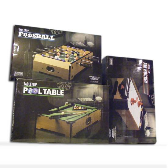 Three different series of tabletop game set, table top football, tabletop hockey and table snooker, with the sizes of 20 x 12 x 4 inches, all of them are made out of durable MDF.