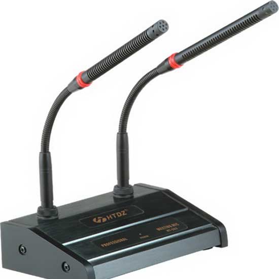 Displayed here is a meeting microphone with red indicator and voice control function. It comes with dual microphones that supports sound reception from two speakers simultaneously. This excellent microphone is perfect for conferences or council chambers.