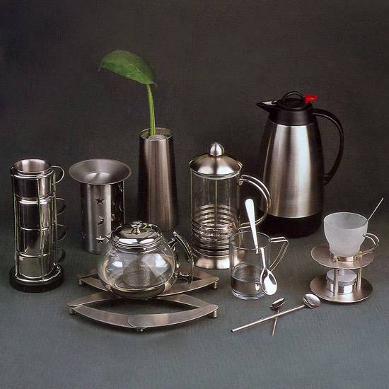 These are high quality stainless steel and glass tablewares. They include tean and coffee pot, cup, glass,plates, vase and etc. All the glass, cup, tea pot and coffee pot come with a handles and all tea and coffee pots are designed with a lid.