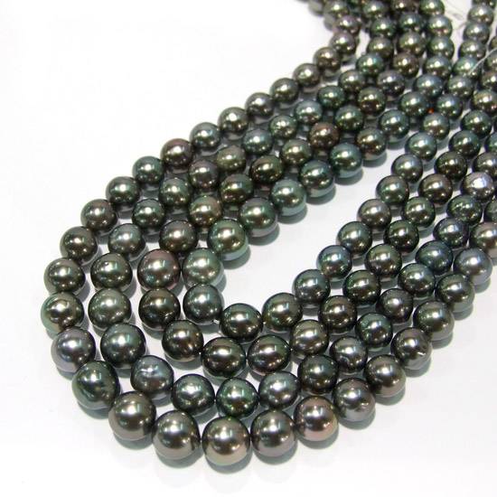 These are strings of temporarily threaded Tahiti pearls for jewellery making, especially pearl necklace. They are round or near-round in shape and have natural colours such as black, dark green and grey, which can be mixed and matched with other pearls and gemstone beads.
