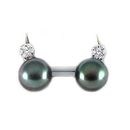 9.5mm Tahitian pearl and diamond stud earrings exhibits high quality pearls of round-shape and excellent Tahitian black color.