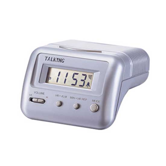 The alarm clock reports time in a clear, recorded human voice. It features alarm function and hourly time report. This alarm clock comes in streamlined curved shape for placing on desktops or beds.