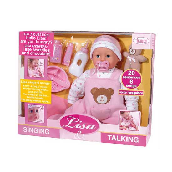 This realistic baby doll is named Lisa that comes with a talking and singing functions, which surely delight your little one. She wears in a pink & white outfit with exquisite tiny patterns. The cute baby is also designed with baby accessories, such as a feeding bottle, a training bow set, a teether and so on.