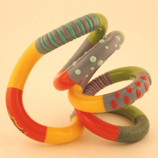 This tangle toy has fun colors and 5 different textures adding great play value as an educational toy or puzzle. It can help students with various learning abilities. It is made of 18 interconnected 2.5" pieces of ABS plastic. It is suitable for ages 3 years or above.