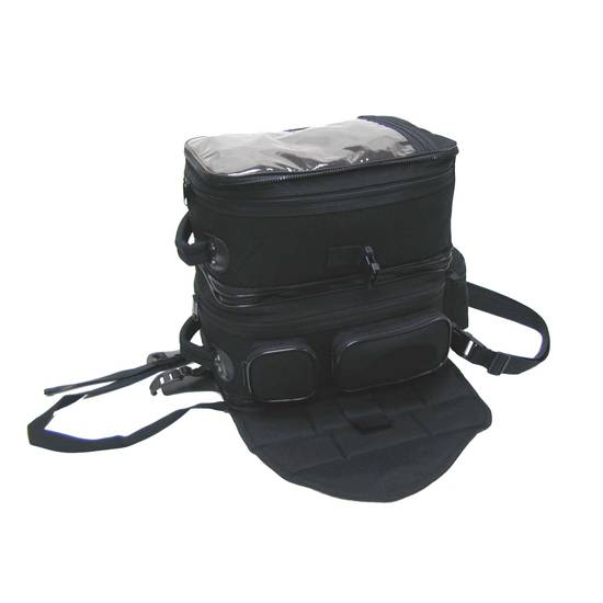 This tank bag is especially designed for motorcycle riders with magnet bottom. The bag includes two large zippered compartments with sides pockets and buckles for added convenience and a plastic waterproof cover to secure your personal belongings. The padded carry handle and removable straps make it even more portable.