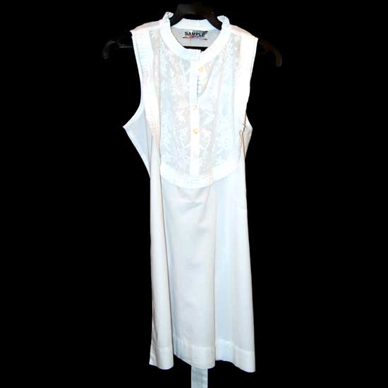 This tank dress features a round collar and golden buttons. The bodice highlights a gauzy texture with hand-embroidered floral and leaf patterns. This elegant dress is a great choice for casual occasions during summer.
