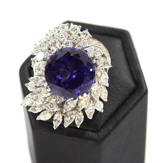 This is a 18K white gold ring with 18ct tanzanite in round shape. There are round and marquise white diamonds set at the upper and lower part of the tanzanite and are separated by ring shoulder with inviable-set white diamonds.