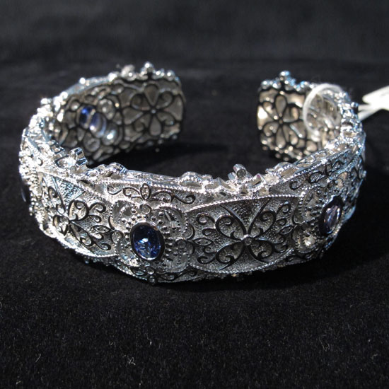 This dainty diamond filigree bangle flaunts a classy vintage look. It is accented with 5 oval deep blue tanzanite stones, showcasing a refined accent. This pretty tanzanite bangle will surely add a feminine finish to your look.