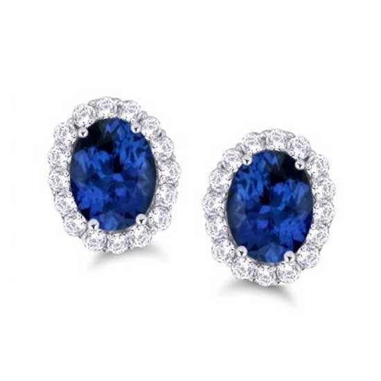 The pair of tanzanite stud earrings features a prong-set oval tanzanite surrounded by sparkling white diamonds. It is delicately crafted to a showcase majestic glitz. This pair of tanzanite set diamond earrings is perfect for evening occasions.