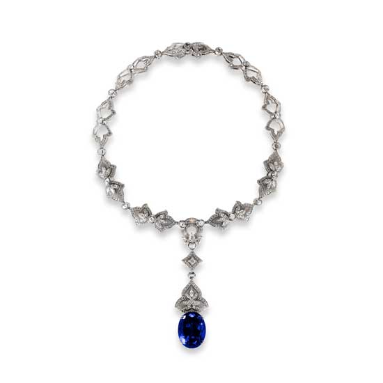 This fancy necklace spotlights an oval-cut tanzanite stone in a deep blue color. The necklace is made of leaf-shaped links accented with twinkling white stones. The stunning necklace is a great addition to your jewelry collection.
