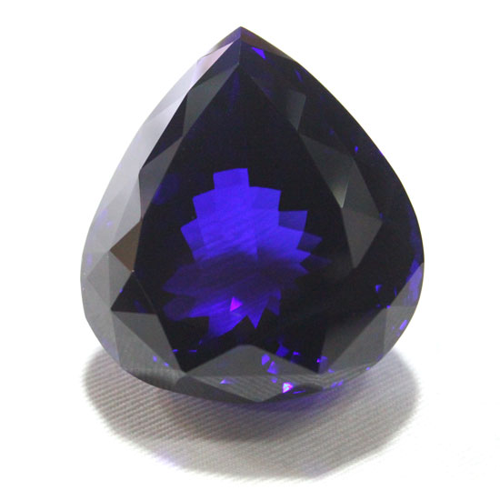 This 410ct tanzanite stone features a unique pear-cut design. The natural tanzanite stone showcases a deep purple color with violet hints. The alluring tanzanite stone will add charm and beauty to any jewelry project.