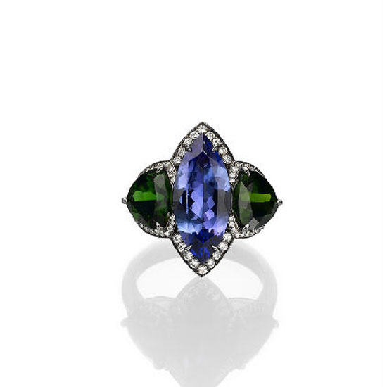 This beautiful ring has a fine outline of diamonds surrounding the deep and exotic tanzanite and tourmaline gemstones embedded in black gold. It is made with excellent workmanship and attention to detail. This ring is a great addition to your fine jewelry collection.