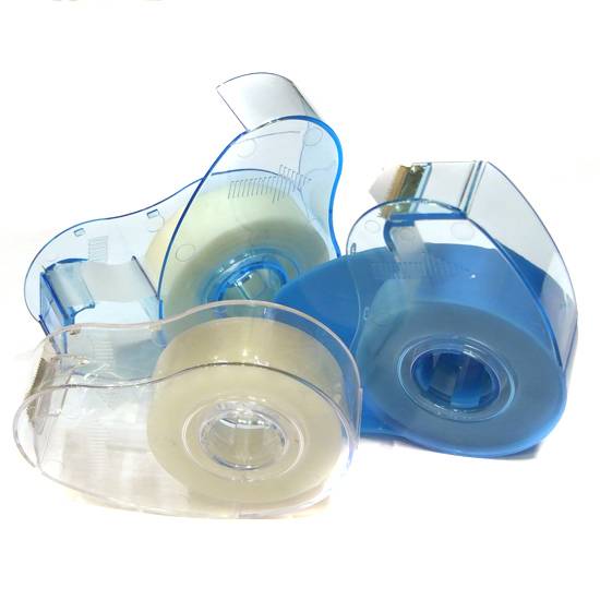 These are tape dispensers which are made of transparent PS materials. The tape dispensers are easy to use, reusable and prevent cutting by the metal blade.