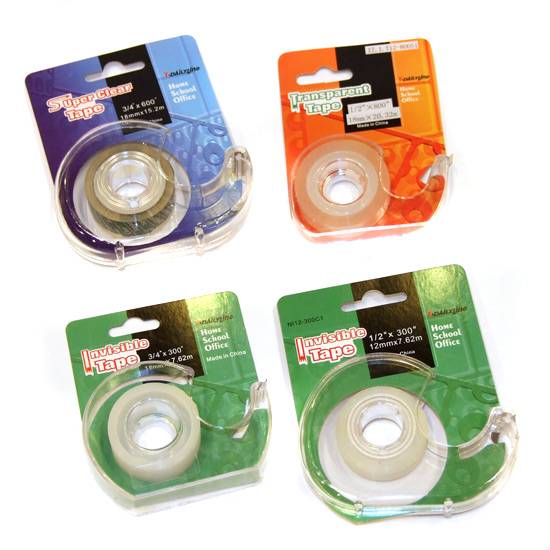 These are tape dispensers which are made of transparent PS materials. The tape dispensers are easy to use, reusable and equipped with cutter inside.