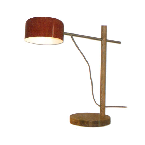 This is a desk lamp with an artistic and stylish design. It features a round lampshade with a red exterior. The stand and base are made of wood in natural colors.