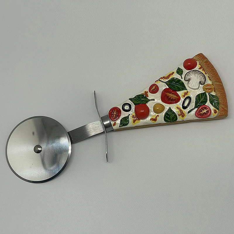This outlined silver pizza cutter makes cutting and serving pizzas just a piece of cake. The blade is meticulously designed for precise and smooth control. The decorated handle flaunts the delicious pizza shape, showcasing a lovely accent.
