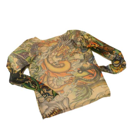 This T-shirt is designed with the colorful tattoo patterns allover for a touch of uniqueness. This long-sleeved T-shirt is made 90% of nylon, which ensures wearing comfort and durability. This tattoo T-shirt is a chic addition to your casual wear collections.