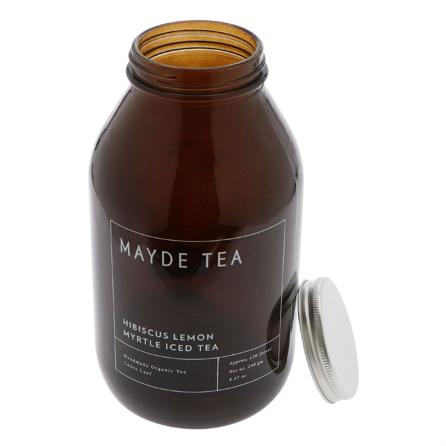This glass jar offers a great way for packaging tea leaves and tea beverages. It has a screw on lid and is printed with product information on the exterior. The glass jar is comfortable to hold and is hygienic and convenient to use.