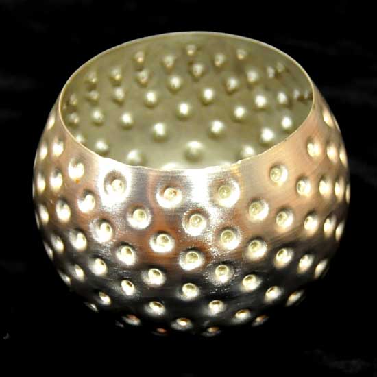Shown here is a tea light holder adorned by embossing spots that convey a sense of luxury. The metal construction of this candle holder offers long-lasting beauty. This ornamental tea light holder is a great embellishment to enhance your bedroom in the nighttime.