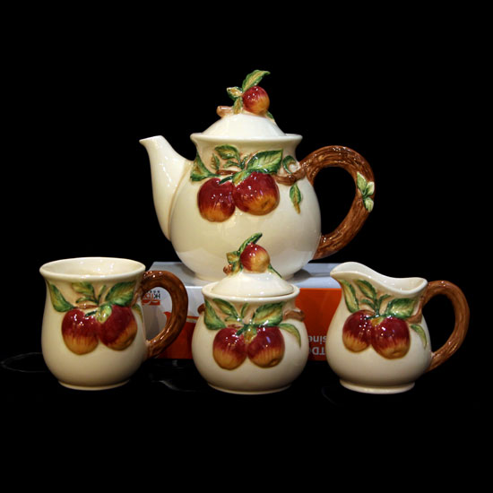 This tea pot set comes with a tea pot, cup, milk server and sugar server. The fruit pattern is unique and adorable, offering a classical touch. This tea pot set is an excellent choice to serve afternoon tea.
