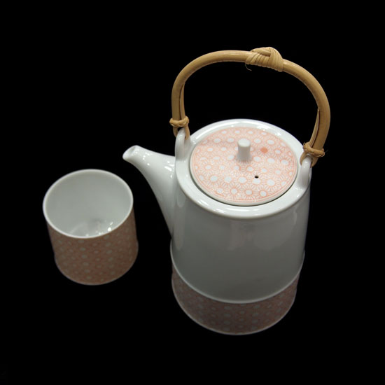 This elegant tea set consists of a teapot, and a cup with orange toned patterns. The teapot is designed with a wood-like handle for extra uniqueness. This sturdy tea set is great for drinking tea.