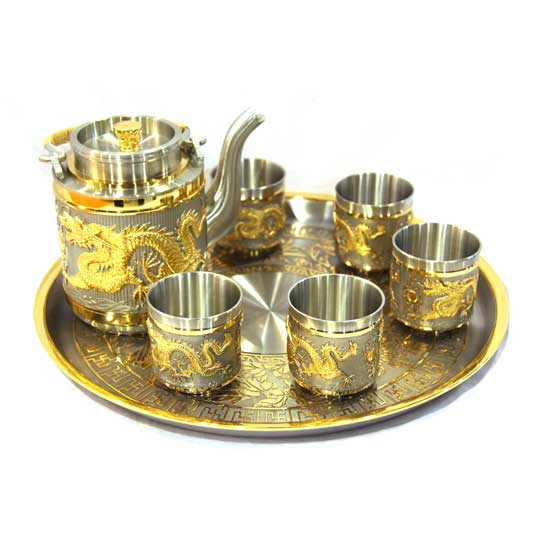 This showcased tea set comes with a tea pot and five tea cups. This tea set features delicate golden dragon patterns for an exquisite touch. This well-made tea set is an ideal addition to brighten up your home décor.