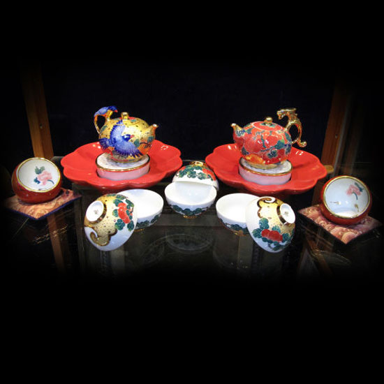 - Tea set with flying dragon and dancing phoenix paired teapots.