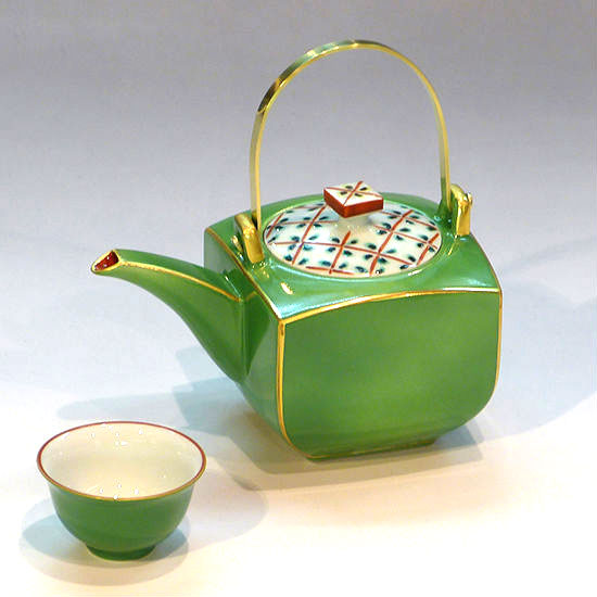 This tea set comes in a tea pot and a tea cup. The tea pot features the shape of a cuboid for an impressive volume. It is difficult to color this jade in green. Only a skilled craftsman can bring out the color.