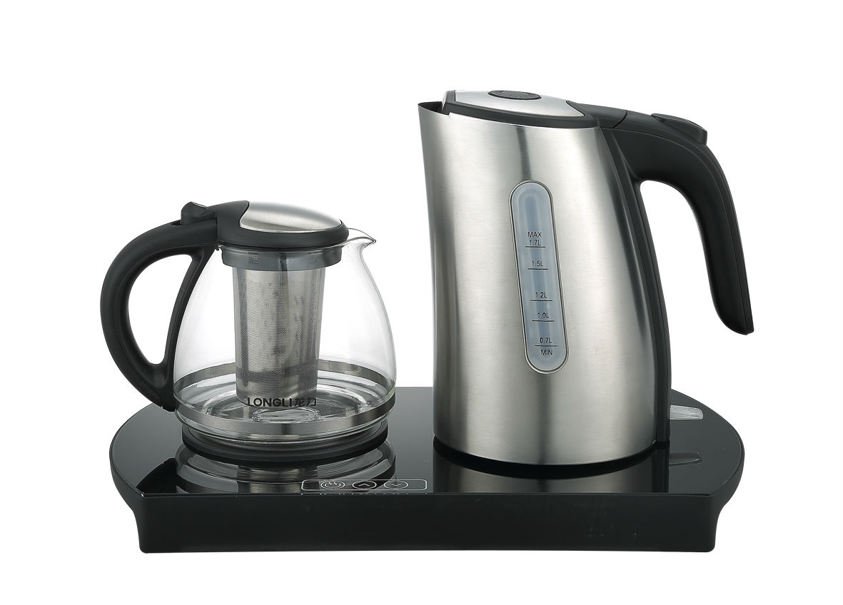 This teaware set offers one oblong heater platform that holds two kettles for serving tea and water. One of which is an all-over clear jug with brew basket, ideal for holding and steeping teas. The other stainless steel one comes in a stylish leaning silhouette, and it possesses all the basic functionalities like boil-dry protection and auto-shut off ability.