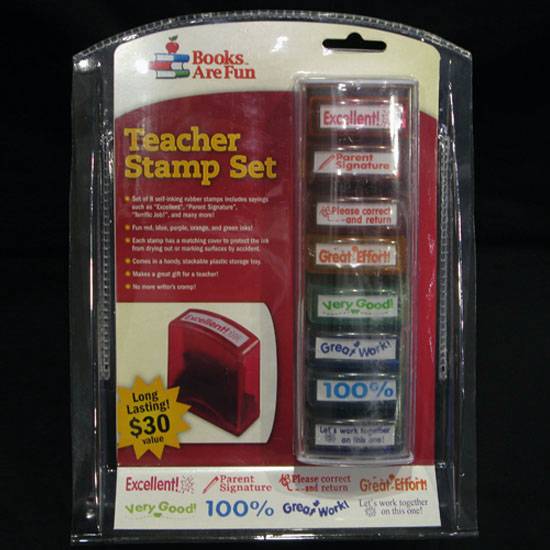 The teacher stamp set includes 8 self-inking rubber stamps with embossed words such as "Excellent", "Great Effort" and "Very Good". They are available in different colors including red, blue, purple, orange and green. This teacher stamp set is handy when marking students' assignments.