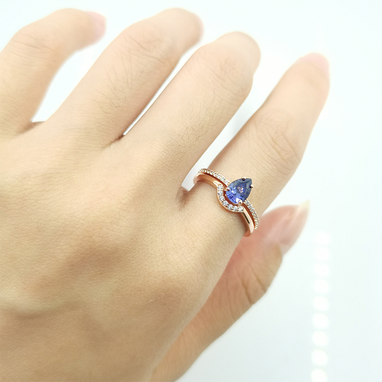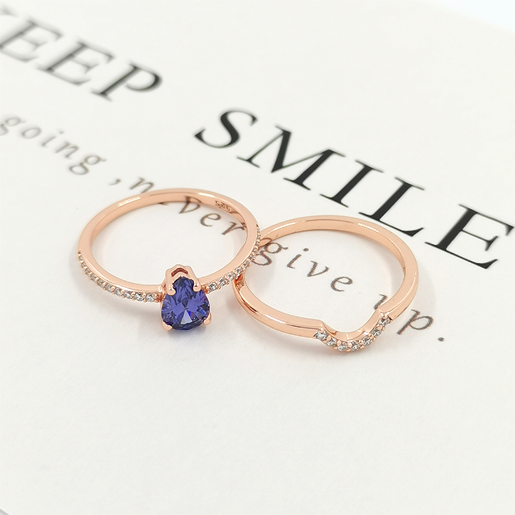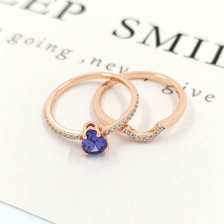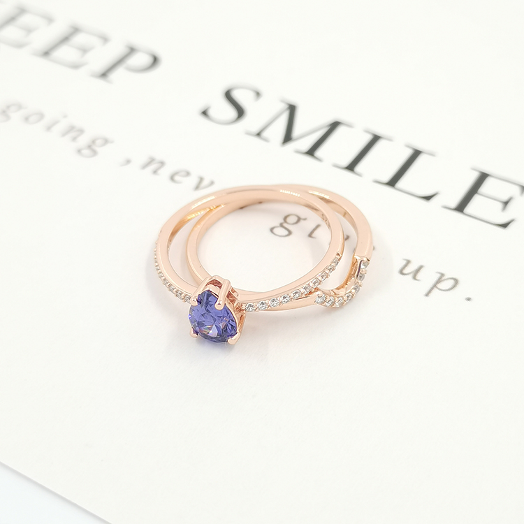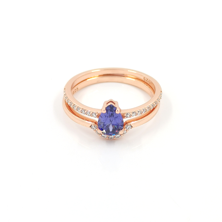 Tear Drop Purple Crystal Women Gold Rose Plated Silver 925 Wedding Ring Set