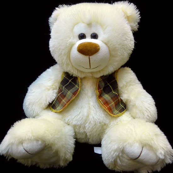 This is a teddy bear with a lovely and cute design. It is dressed in a printed vest with colorful checked patterns. The high-quality polyester material lets it have a smooth and soft texture.