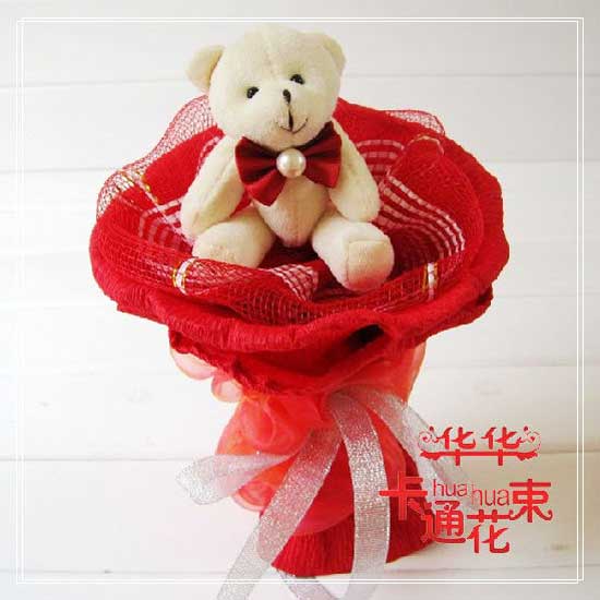 This is a teddy bear bouquet that comes in a beautiful red color. With a single teddy bear in the middle, this lovely bouquet is decorated with mesh and ribbon. This teddy bear bouquet is a great choice for gifts.