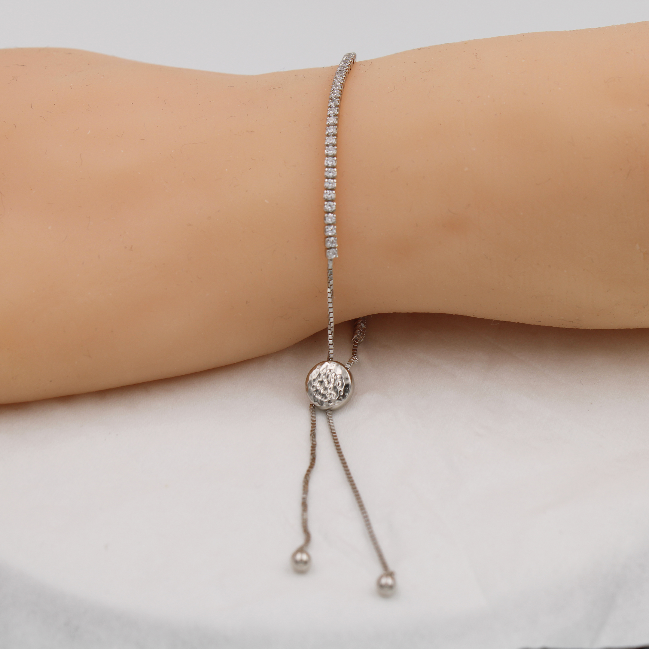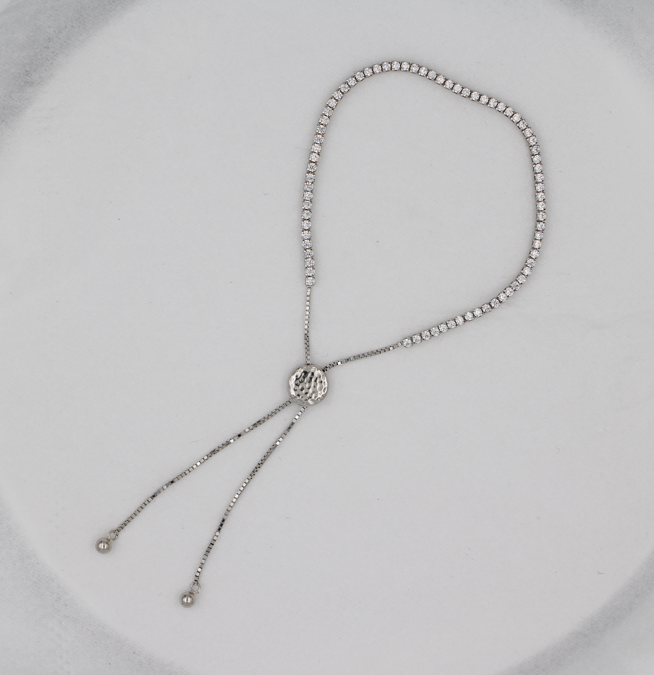 Adjustable Tennis bracelet, 10" x 1 row, consisting of 5" long silver chain bracelet with 1mm white cubic zirconia and other 5" (both side 2.5" long) silver chain bracelet for adjustable.