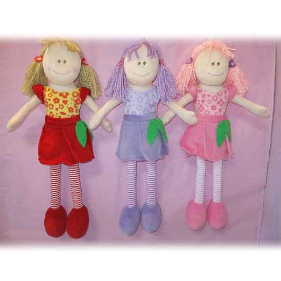 Displayed is a textile doll that features slim arms and legs. This doll is dressed with a top and skirt and has a matching hair color. With a big smile on the face, this textile doll is available in three colors for you to choose from.