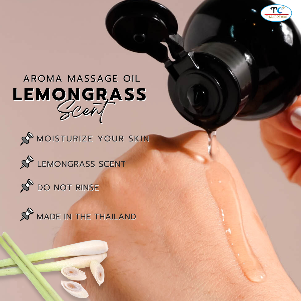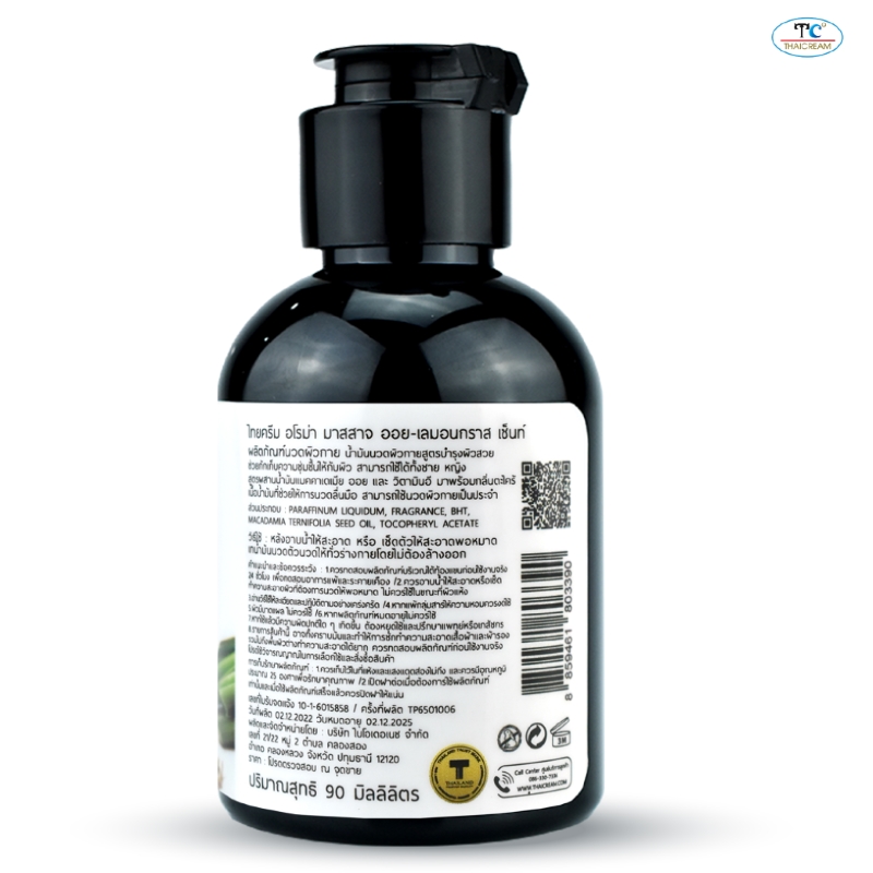 ThaiCream Aroma Massage Oil – Lemongrass Scent is a spa-quality body massage oil that combines Thai-inspired aromatherapy with skin hydration. Featuring a lightweight, non-sticky texture, this oil glides smoothly across the skin, making it ideal for a relaxing massage experience. The refreshing lemongrass fragrance offers a harmonious balance between traditional Thai notes and modern spa aromas, suitable for both men and women. Perfect for use after showering to help retain skin moisture and leave the skin feeling soft, nourished, and delicately scented.